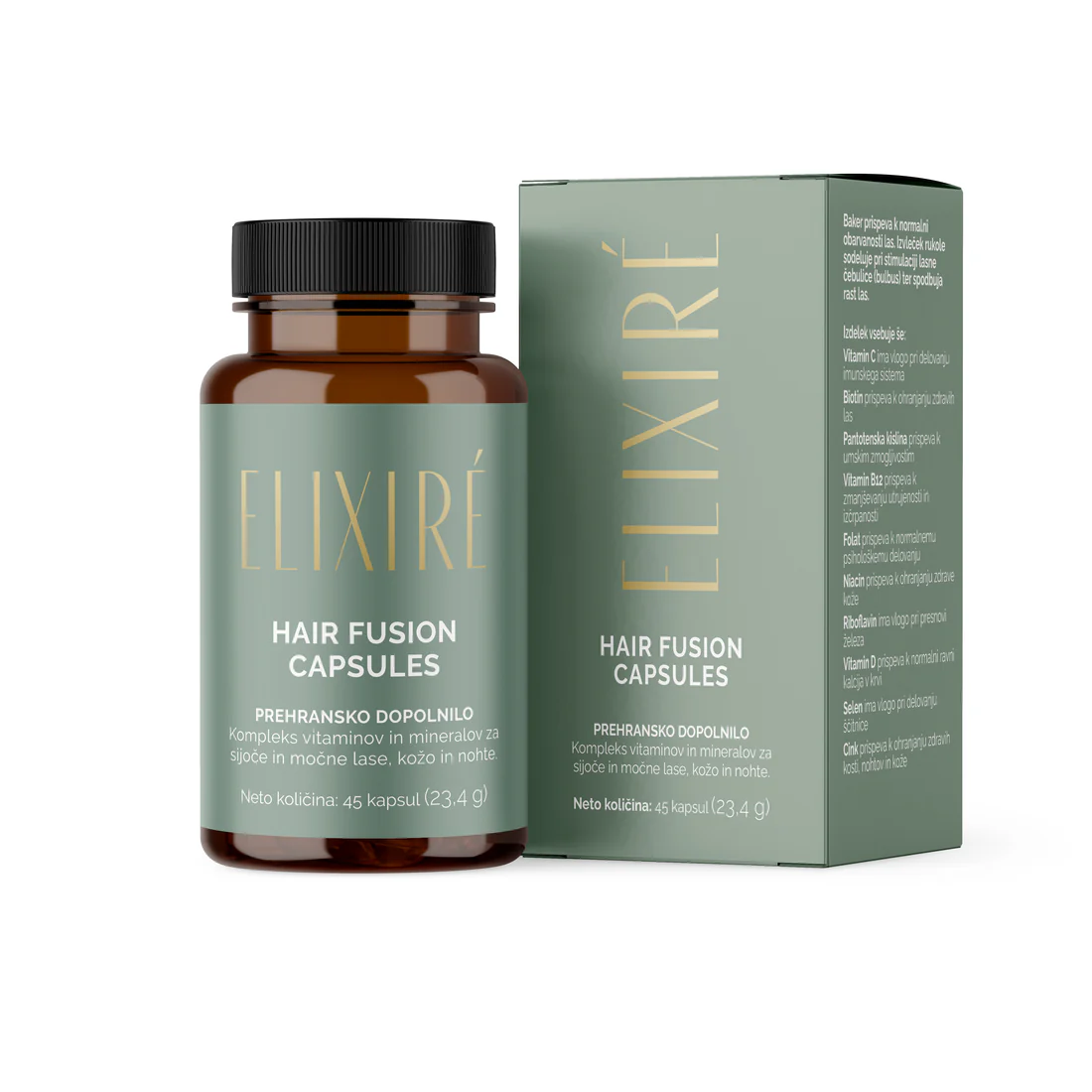 Prehransko dopolnilo ELIXIRÉ Hair Fusion kapsule vam pomagajo, da ohranite sijoče lase, mladosten videz kože in čvrste nohte ter dajejo celostno podporo telesu od znotraj navzven z napredno kombinacijo 15 vitaminov, mineralov in rastlinskih izvlečkov.
