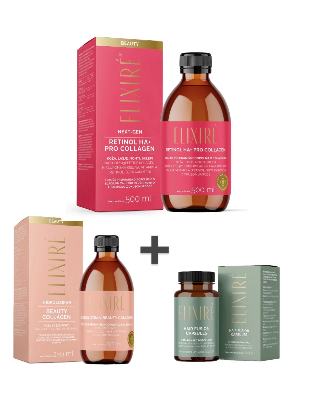 ELIXIRÉ RETINOL HA+ PRO COLLAGEN je inovativno premium tekoče prehransko dopolnilo s 5000 mg NATICOL® X3PEPTIDE hidroliziranim ribjim kolagenom, ki dokazano v 8 tednih: