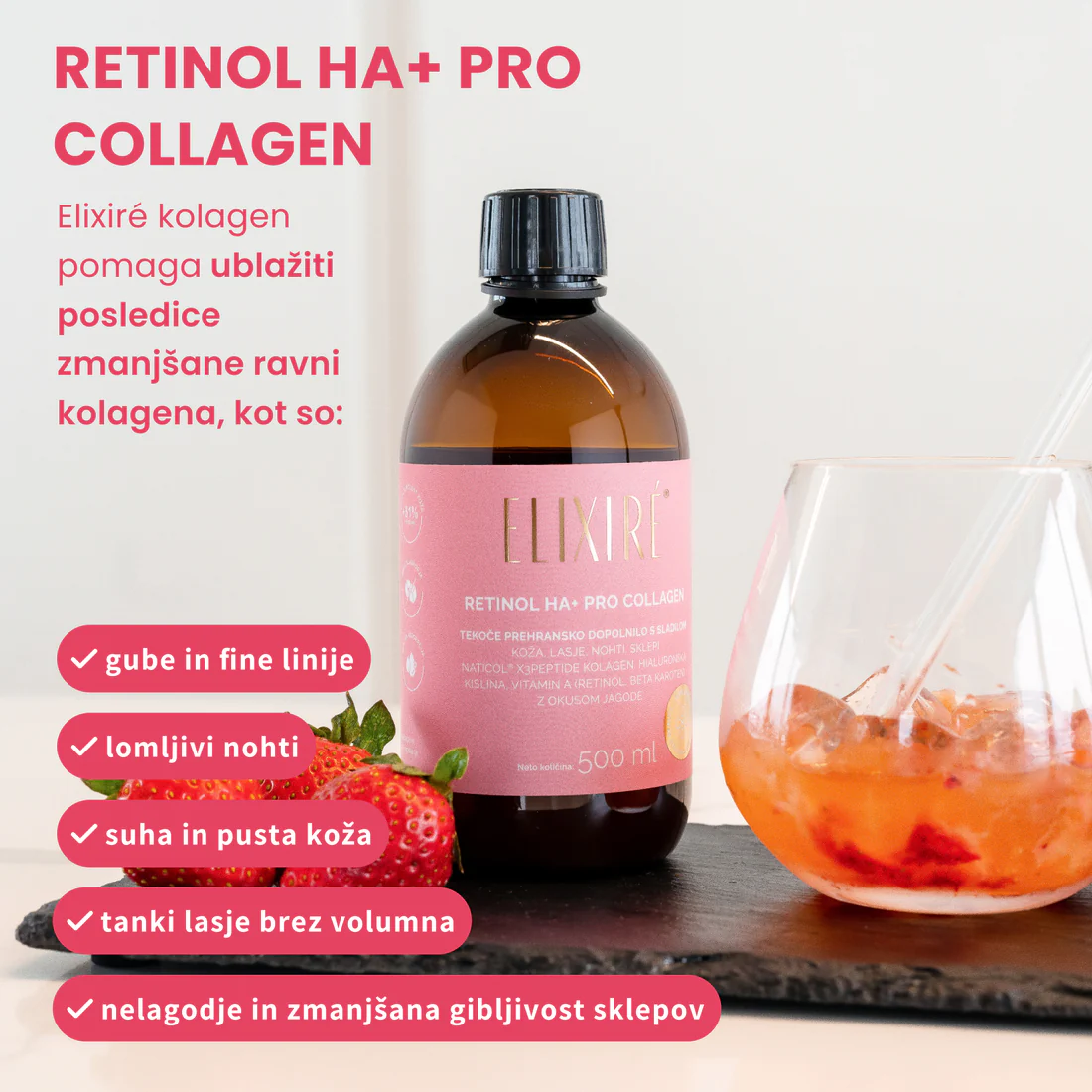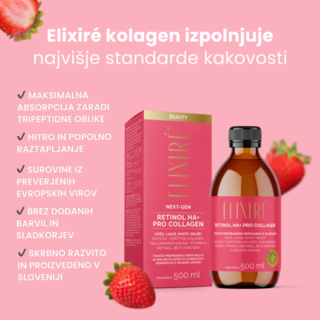 Sestavine: voda, Naticol® tripeptide MG (ribji kolagen), sredstvo za zgostitev: glicerol, sredstvo za uravnavanje kislosti: citronska kislina, hialuronska kislina (nizko molekularna), naravna aroma jagode, vitamin C, konzervans (kalijev sorbat), retinil acetat, beta-karoten, rdeča pesa v prahu, sladilo: steviol glikozidi iz stevie.