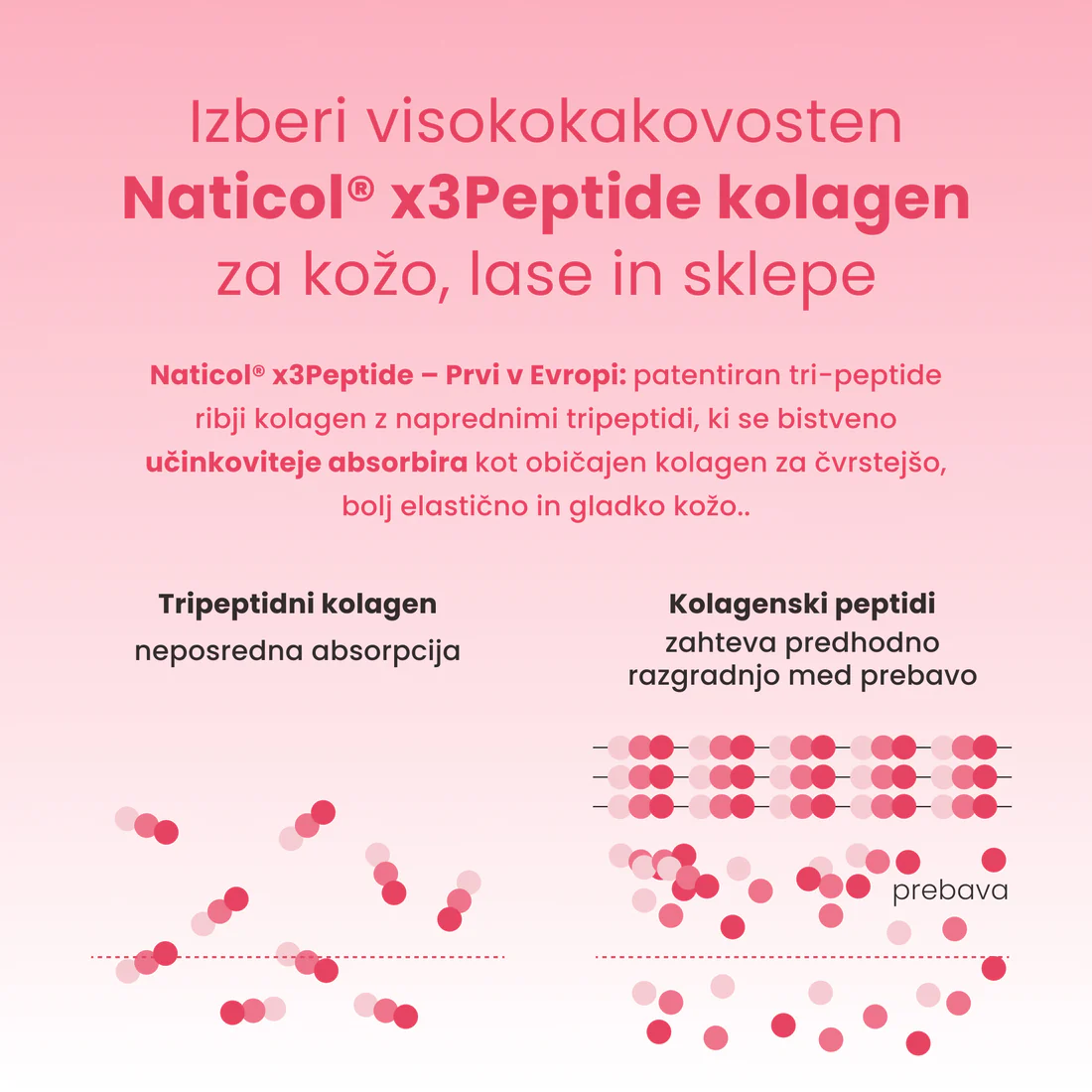 Učinkovitost in kakovost kolagena Naticol® x3Peptide sta potrjeni s številnimi kliničnimi študijami. Mikrogranulirana tehnologija Naticol® x3Peptide kolagena, z naprednimi tripeptidi sestavljenimi iz 3 aminokislin, omogoča optimalno topnost, tarčno delovanje, hitro absorpcijo in opazne rezultate že v 8 tednih, pri videzu kože, las, nohtov.
